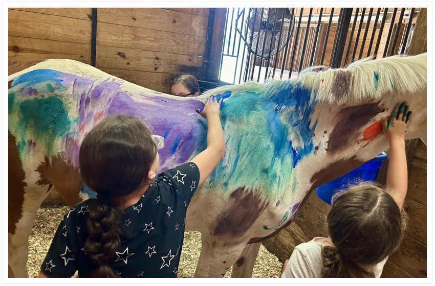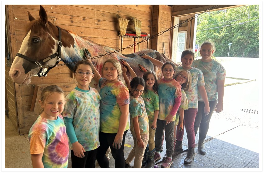 Each day, campers should bring lunch (pizza on Friday, do not bring lunch), snacks, beverages, sunscreen, bug spray and an extra change of clothes. There is a refrigerator for food and beverage storage. Campers are required to wear boots with a hard, flat sole and 1/2″ heel that covers the ankles (a paddock boot/work boot) when riding. Long, close fitting pants are required during mounted lessons (breeches, jeans, sweat pants).